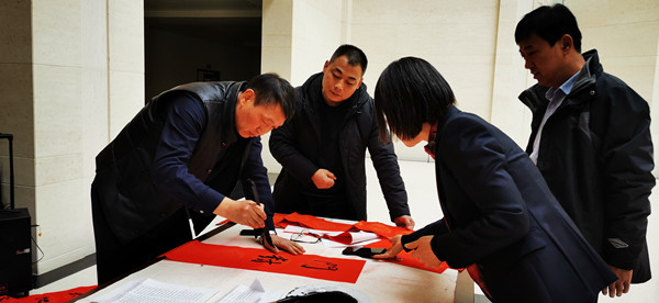 职工的喜爱和高度评价愈加激发了书法家们的书写热情,他们顾不上喝水歇息,挥毫泼墨,满足职工的需求。不知不觉3个小时过去了,200多幅春联和“福”字被职工接纳,书法家们为职工送上了“年味十足”的精神文化大餐。