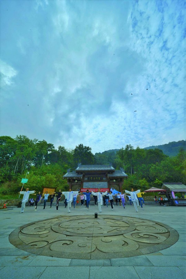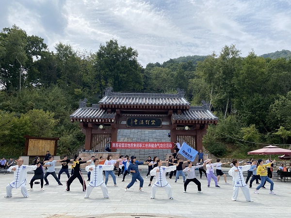 在两座大山之间的空中表演更是惊险刺激。看完空中走钢丝和自行车表演,职工集中在山上广场,拉起“陕西省煤田地质集团”横幅,集体展演了健身气功八段锦和五禽戏,庆祝第四届世界健身气功日,为这次登山活动增添了浓墨重彩的一笔,引得游客纷纷围观拍照。