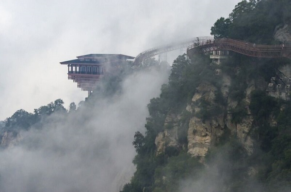 首先乘游览车沿着山谷到达索道入口,很快大家就来到山上,游览潜龙寺景区。站在观景台上远眺,龙首阁和宛延的栈桥步道相连,在蓝天白云和大山的衬托下,就象一条巨龙冲山而出,蔚为壮观。沿着栈桥前行,职工纷纷汇聚到龙首阁,隔着四周通透的玻璃俯瞰环周和脚下的山峦翠绿,景色美不胜收。