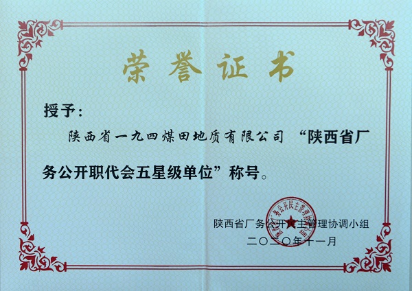 一直以来,陕西省一九四煤田地质有限公司把职代会为主要载体的厂务公开作为加强民主政治的基本建设来抓,夯实厂务公开职代会工作基础,加强组织领导和制度保障,确保厂务公开职代会工作规范运作,发挥职代会主体作用,推进厂务公开纵深发展,不断丰富公开的内容,拓展公开的形式,拓宽公开渠道。自2014年荣获厂务公开职代会“四星级”单位以来,积极推进厂务公开职代会“五星级”单位创建工作,维护广大职工权益,保障职工主人翁地位,加快了公司民主化管理进程,促进了公司经济发展与和谐企业文化建设,取得显著实效。在全体职工共同努力下,公司先后荣获“陕西省文明单位标兵”、 “陕西投资集团先进基层党组织”、“陕西省能源化学地质系统模范职工之家”等荣誉称号。