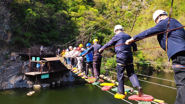 下午,天空依然晴朗,员工们来到紧邻牛背梁的终南山寨开展团建活动。首先映入眼帘的终南山寨大门与大自然浑然一体,给人一种古朴神秘的感觉。走过仿古老街,绕过运动乐园、阳坡院子等连成的休闲游览区,在拓展训练营体验了步步惊心、勇攀高峰、滑索飞人等十余个项目。大家互相鼓励加油,增强信心,凝聚力量,超常发挥,大多数员工基本都是打了通关,也有没把握好平衡而无险落水的,给活动增添了乐趣。通过这次团建活动也使员工切身体会到团队的氛围可以激发个人潜力,如果没有团队力量的传递个人很难达到最佳状态,增强了集体观念,提升了团队精神。