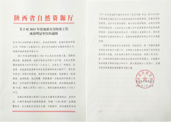 集团公司2021年度地质灾害防治技术支撑工作受到省厅通报表扬